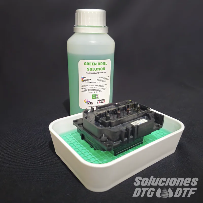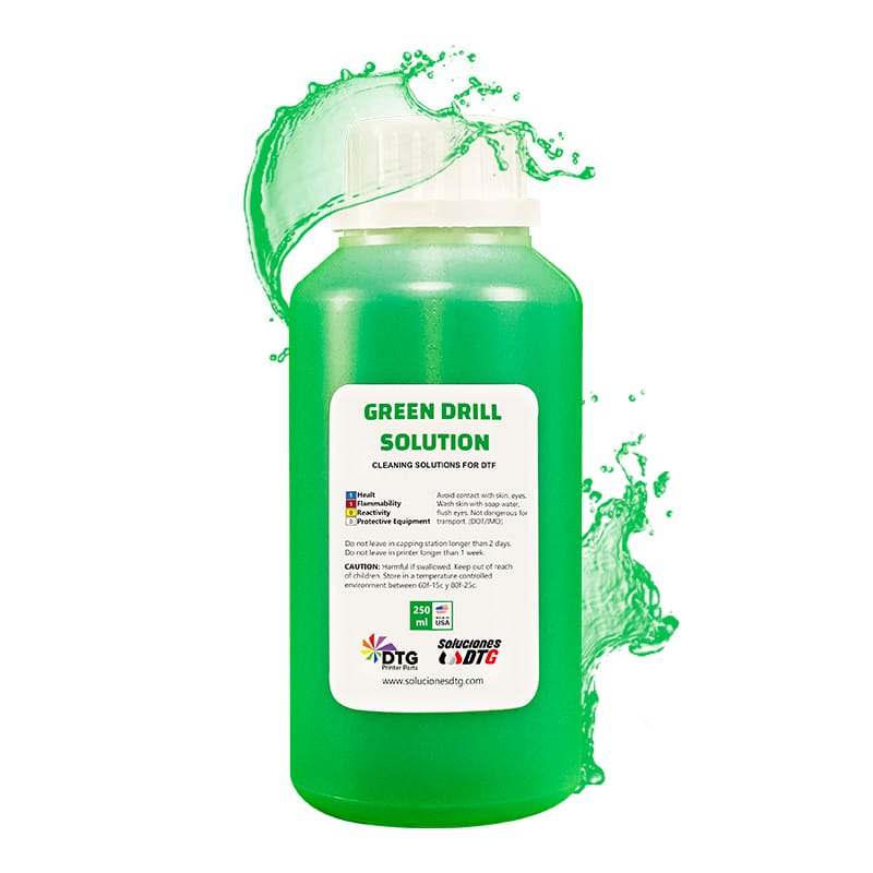 La Solución de Mantenimiento Green Drill limpia a fondo los cabezales de impresión, eliminando en gran medida sedimentos y obstrucciones que afectan la calidad de impresión. Compatible con Epson i3200, XP600, TX800, DX5 y más.