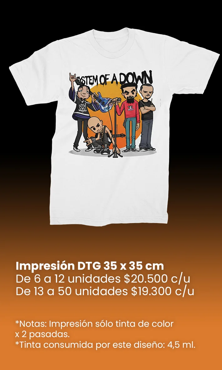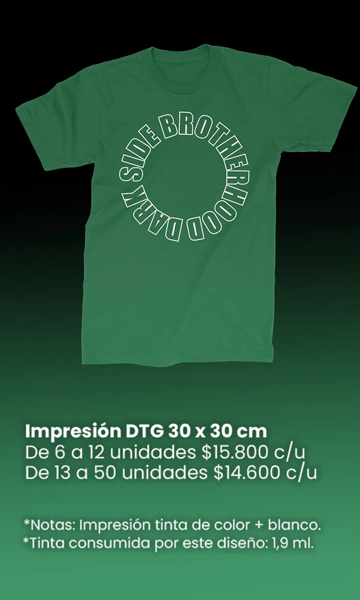 El costo de la impresión digital DTG depende de la cantidad de tinta que consuma el diseño. Por ello, a mayor tamaño o nivel de relleno del gráfico, mayor será el consumo de tinta y, en consecuencia, el costo de impresión.