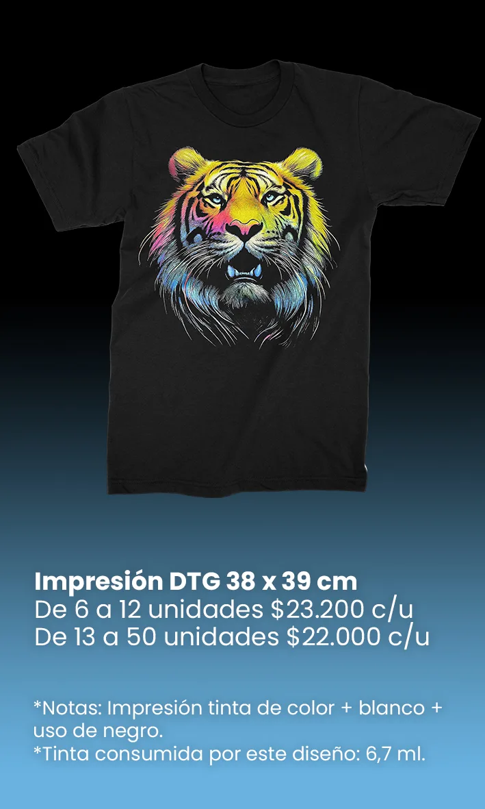 El costo de la impresión digital textil DTG depende de la cantidad de tinta que consuma el diseño. Por ello, a mayor tamaño o nivel de relleno del gráfico, mayor será el consumo de tinta y, en consecuencia, el costo de impresión.